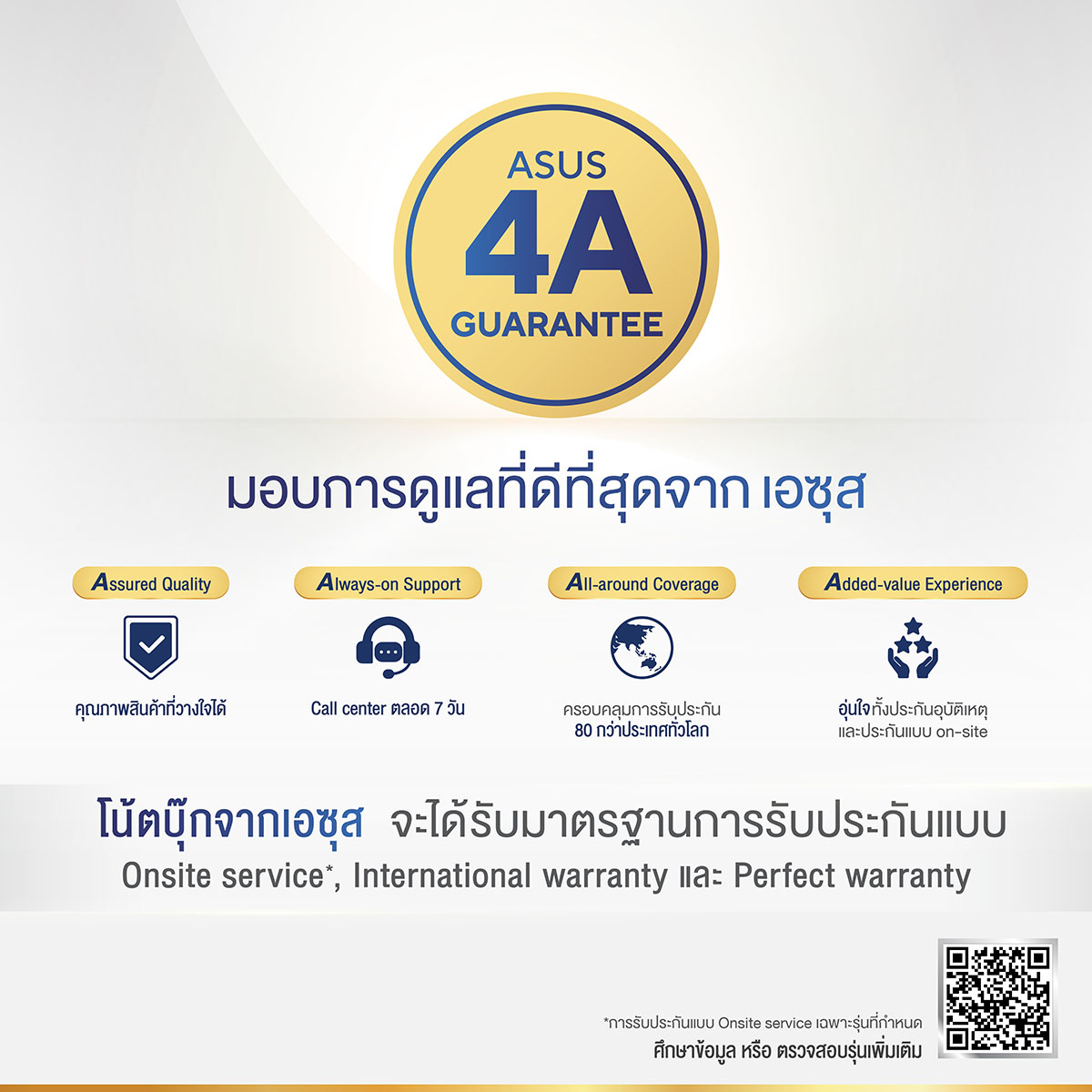 8. ภายใต้เงื่อนไขการดูแล 4A จากเอซุส จะได้รับการรับประกันมาตรฐาน On-Site Service 2 ปี, International warranty 2 ปีและ Perfect warranty 1 ปีแรก