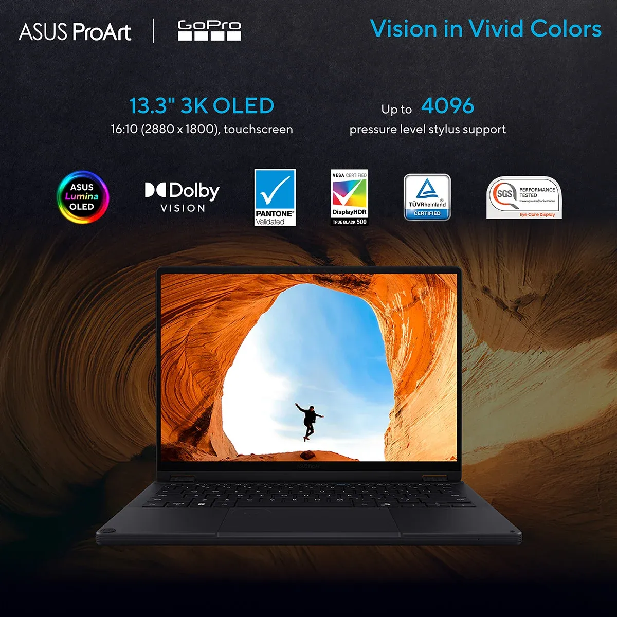 | Display | 13.3 inch 3K (2880 x 1800) OLED 16:10 aspect ratio, 0.2ms, 60Hz, Brightness 400 nits, Peak Brightness 500 nits (HDR), 100% DCI-P3, Gamut Mapping Yes, Contrast Ratio 1,000,000:1, VESA DisplayHDR True Black 500, 1.07 billion colors, PANTONE Validated, Glossy display, 70% less harmful blue light, TÜV Rheinland-certified, SGS Eye Care Display, 85% screen-to-body ratio (Touch screen) |